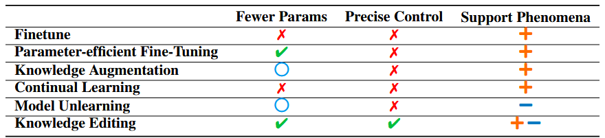 如表 1 所示,知识编辑与简单应用现有方法不同,知识编辑需要对 LLMs 的运作方式有更深入的理解。它不仅涉及将已知技术应用于新模型,还关乎理解和操纵 LLMs 中细致入微的知识存储和处理能力。此外,知识编辑代表了一种更精确和细粒度的模型操纵形式,因为它涉及选择性地改变或增强模型知识库的特定方面,而不是对整个模型进行广泛的重新训练或微调。这些特性使得知识编辑成为更新和优化 LLMs 以应对特定任务或应用的潜在更高效和有效的方式。