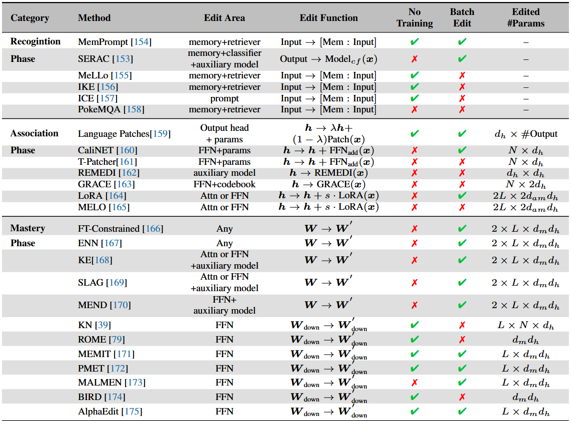 LLM 的发展已达到其能力与人类认知过程极为相似的程度,尤其是在学习和获取知识方面。借鉴人类学习的方式,我们可以将这些概念类比应用于编辑 LLM 的过程,如图 2 所示。
